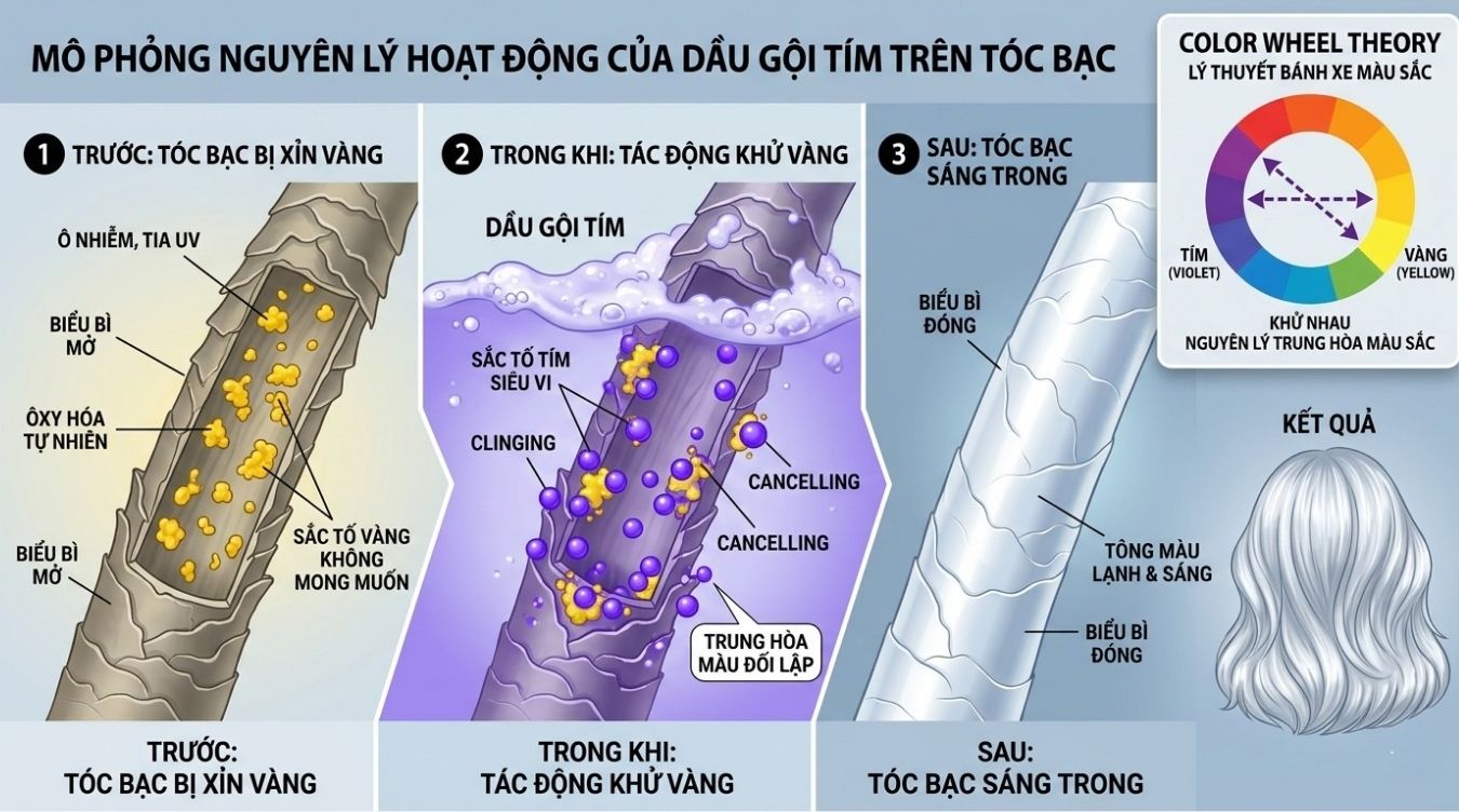 Chính lớp sắc tố nhẹ này giúp trung hòa những tông màu vàng trên tóc bạc, mang lại vẻ ngoài sáng và lạnh hơn. Không giống thuốc nhuộm, dầu gội tím không thay đổi màu tóc vĩnh viễn mà chỉ điều chỉnh sắc độ trong thời gian ngắn.