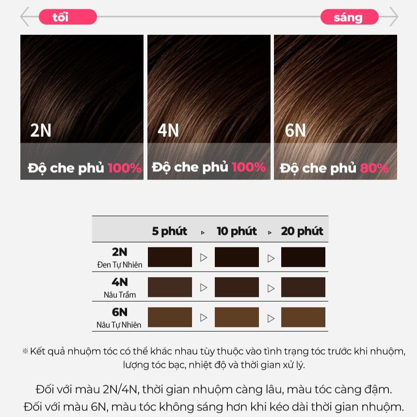 Có các tông màu phổ biến cho phủ bạc + nhuộm cơ bản: 2N (Natural Black), 4N (Dark Brown), 6N (Natural Brown)